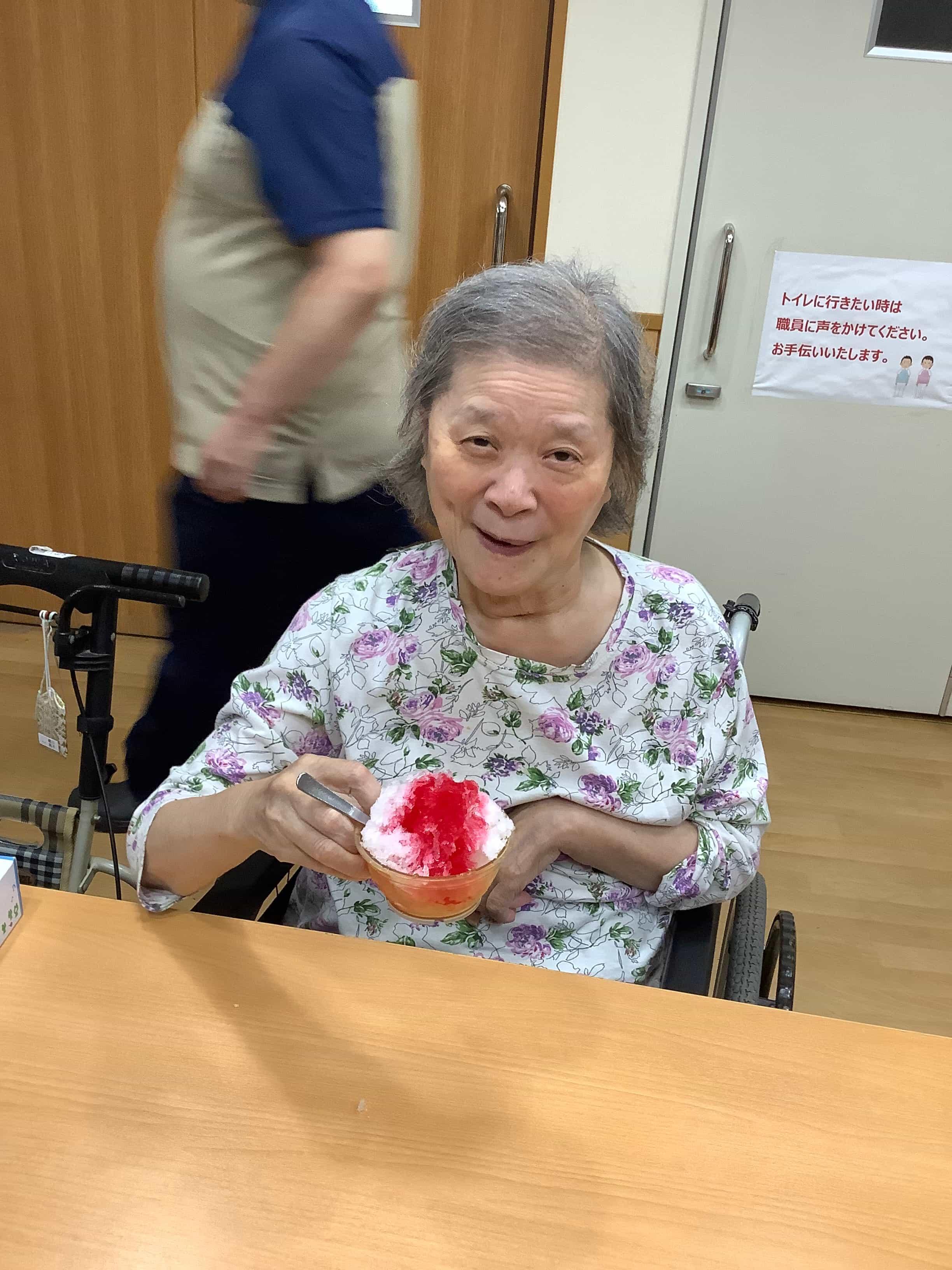 特別養護老人ホーム 「かき氷レクリエーション」 利用者様に夏を感じて頂きたく、かき氷レクリエーションを行いました! 3種類のシロップを用意し、その中から好きな味のシロップを選んでいただきお作りしました。食べ始めると利用者様から「美味しい」と感想がうかがえました。 利用者様、職員含め、全員で楽しめたレクリエーションになりました!