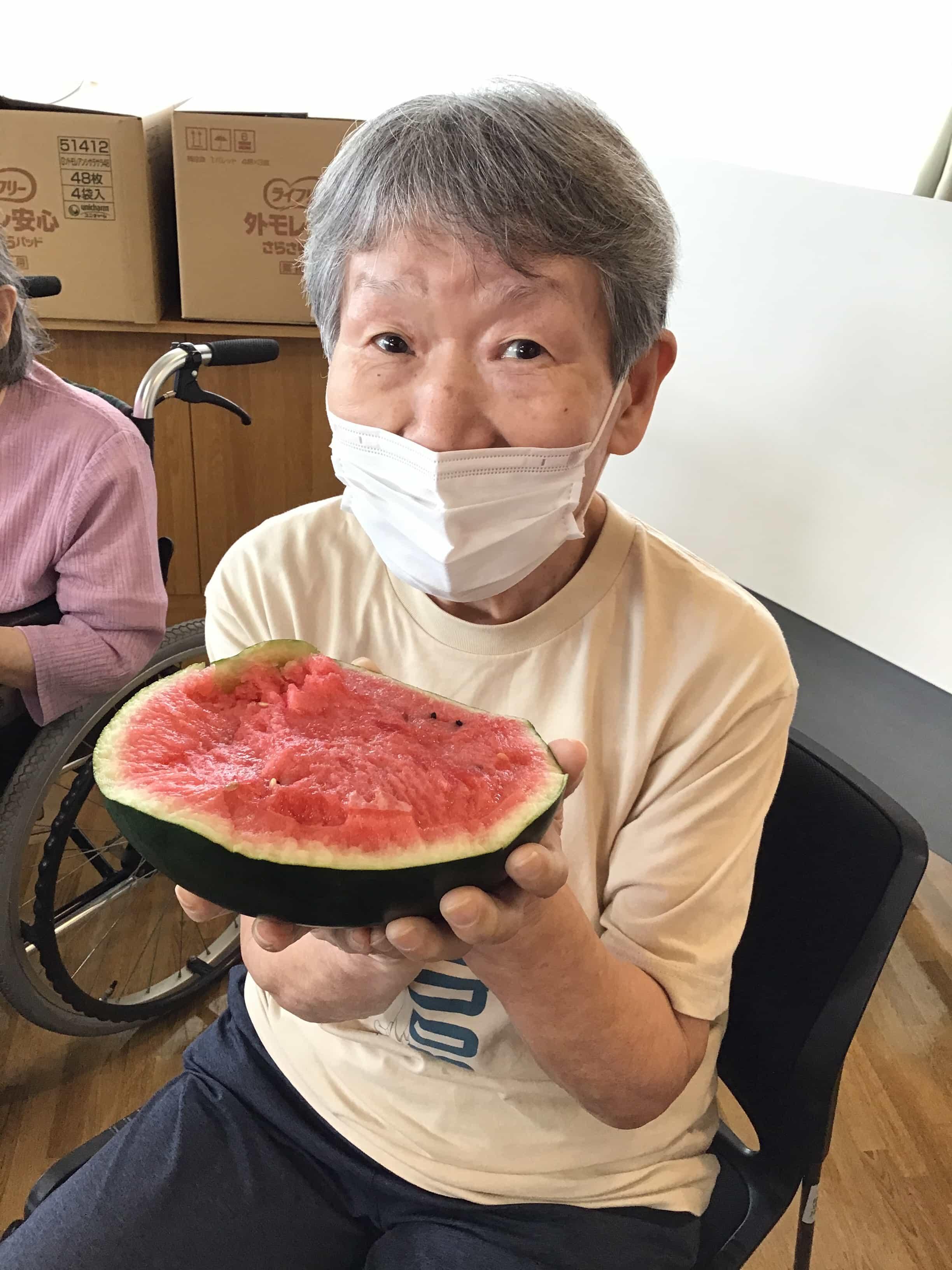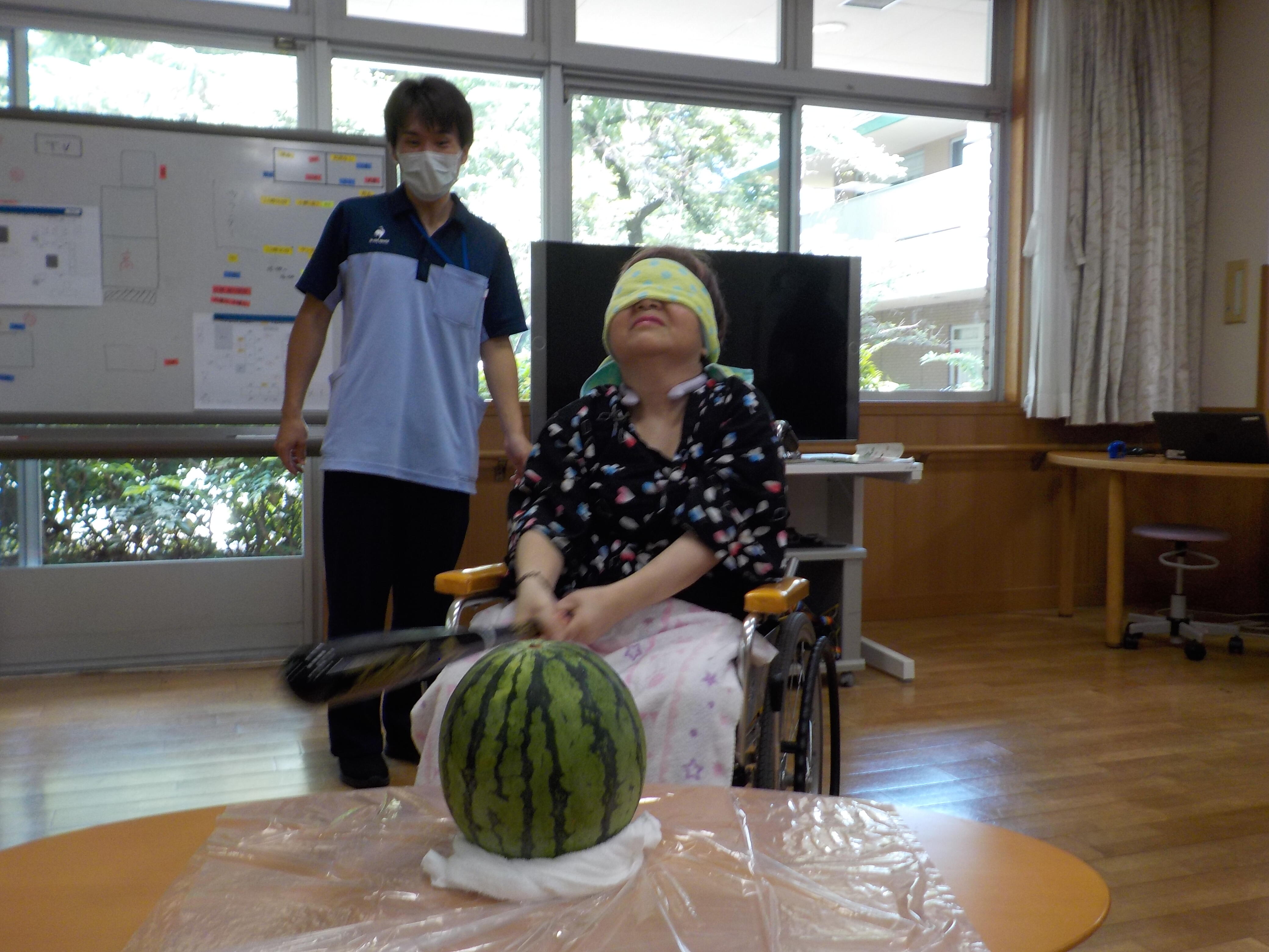 障害者支援施設 「スイカ割」 障害事業所では、毎年恒例となっているスイカ割りを今夏も行いました。「昨年はあまり上手に割れなかったから...」と、棒の代わりに、ご自宅から野球のバットをご持参くださった利用者様もいました。目隠しをした状態で、まっすぐに棒を振り下ろす動作は意外と難しく、多くの方が苦戦されていました。 昼食には、トマトやきゅうり、ハム、かき揚げなどをトッピングそうめんと、デザートには、もちろんスイカを頂きました。「あまーい」「今年のスイカは美味しいね」と皆様笑顔でお召し上がりになっていました。