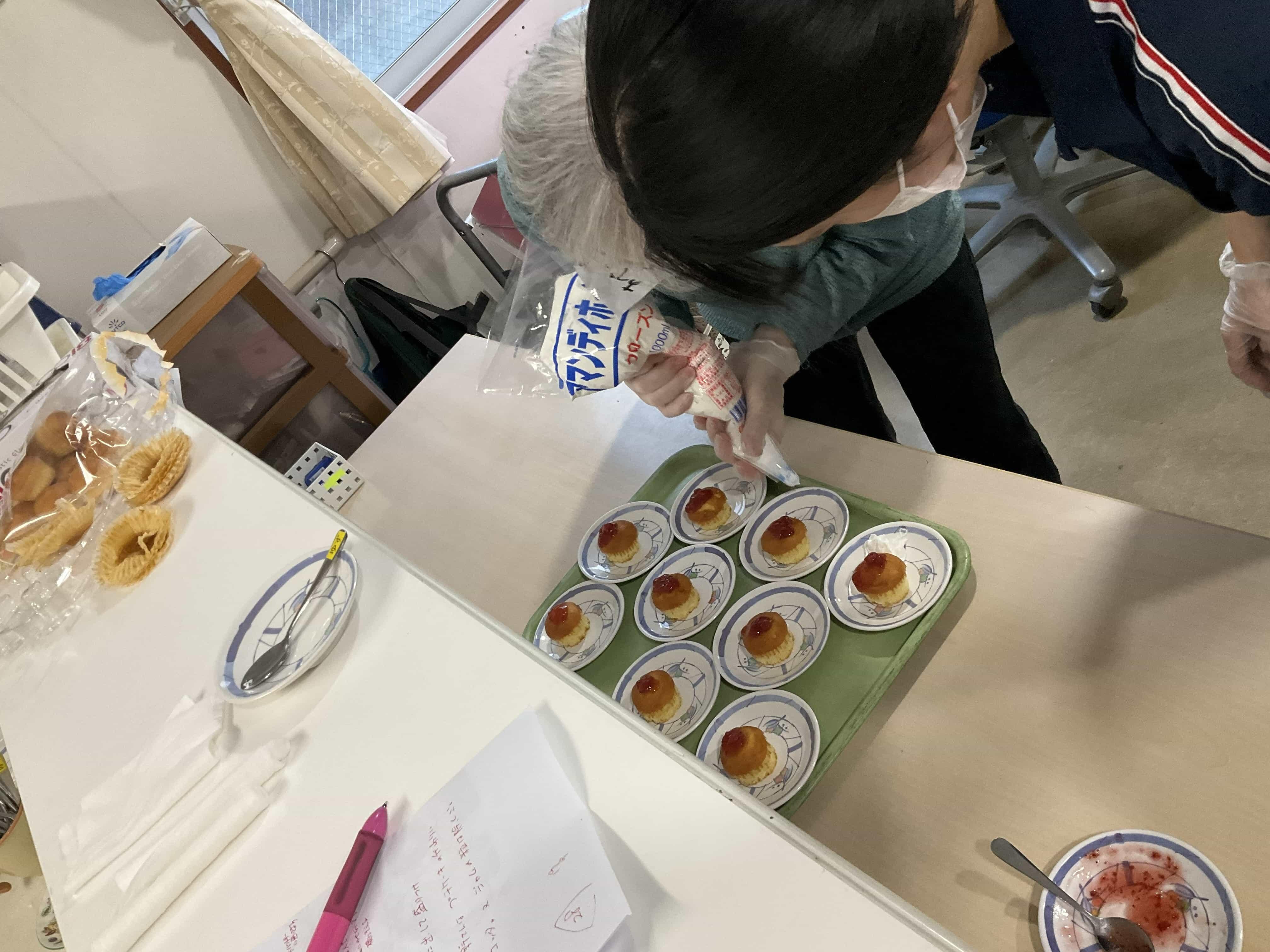 デイサービスセンターゆずりは 「ケーキ作り」 デイサービスセンターゆずりはでは、季節に合わせて利用者様に手作りおやつを作って頂いておりますが、今回は、クリスマスに合わせて利用者様にプチケーキを生クリームとジャムでかわいらしく飾りつけをしていただき、おやつの時間に皆様一緒に食べて頂きました。 ケーキは、とても可愛くできあがり、召し上がった利用者様も、「とってもかわいい!」「とても上手にできたわね」「いつものおやつよりもおいしく感じるわ」と笑顔がこぼれ楽しく美味しく召し上がっていただきました。