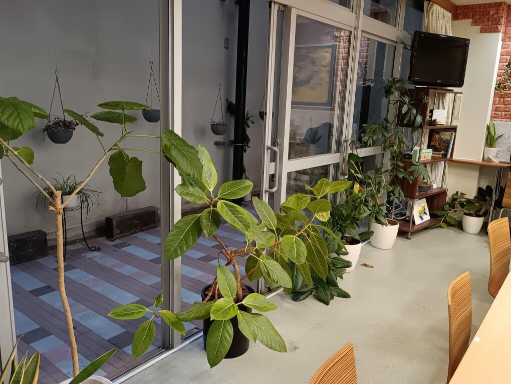 今月の江古田の森 ~職員食堂のご紹介~ 江古田の森には地下1階に職員食堂があります。職員はここで利用者様と同じメニューの食事をとり、仲間と談笑するなどして休憩を取っています。ほっと一息つく場所ですが、残念ながら地下のため、外の光が差し込みません。どうしても暗い雰囲気でしたが、最近たくさんの観葉植物が並びとてもさわやかな雰囲気になりました。これは江古田の森の管理栄養士さんが、自宅から寄付してくれたものです。なかなか嬉しいことをしてくれるではありませんか!新鮮な空気を吸って、リフレッシュできそうです。 さぁ、お腹も心も満たし、後半もしっかり皆さまのためにお仕事頑張ります!!