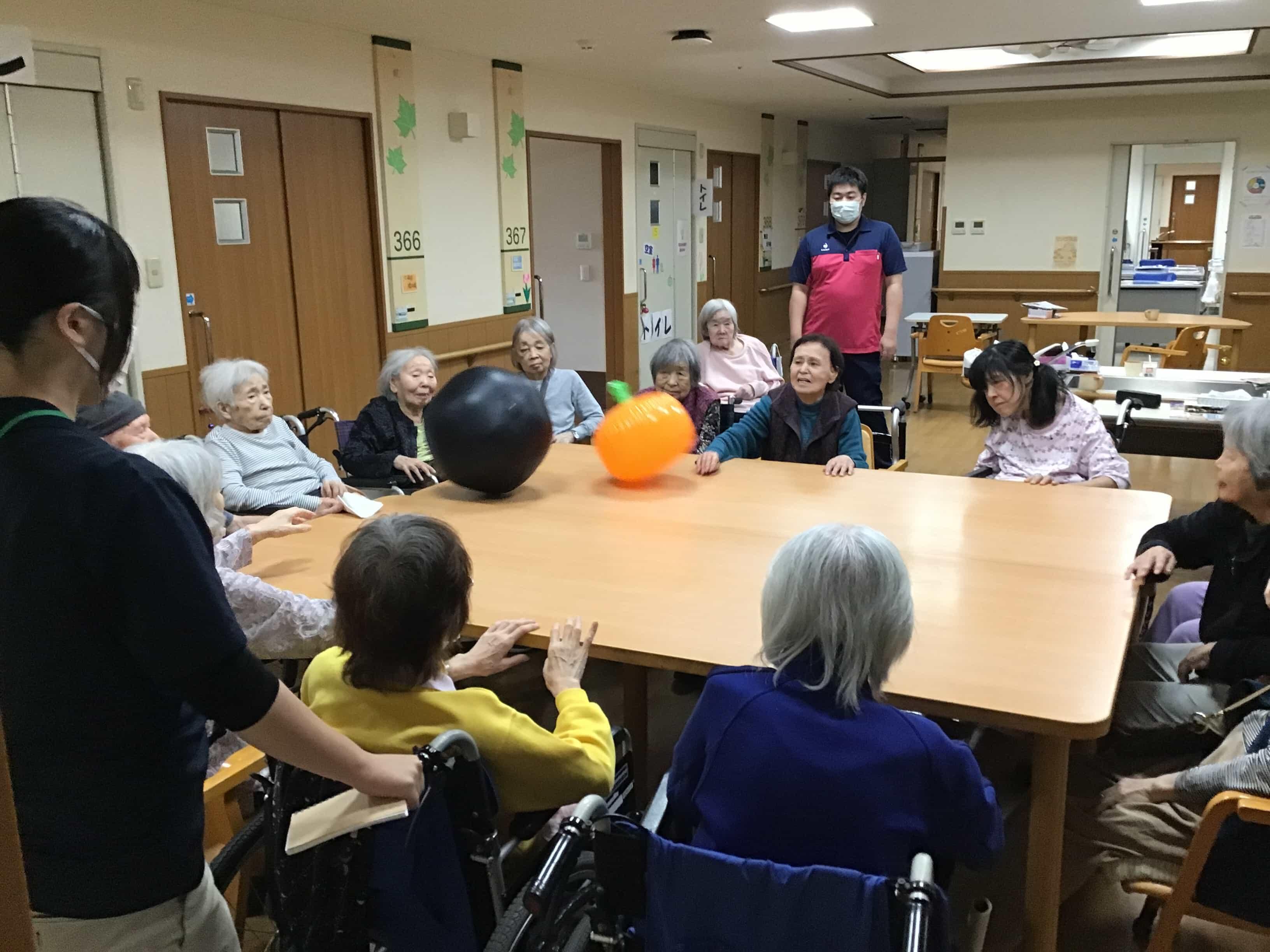 介護老人保健施設 「風船レクリエーション」 日々のレクリエーションの様子をご紹介します。今週は、テーブルを囲んで風船を使ったレクリエーションを行いました。皆さま笑顔で参加され、ボールへと自然に手が伸び、声をかけあいながら和やかな時間をすごされました。職員が見守りと声かけを行いながら、安心して楽しまれておりました。