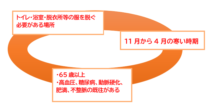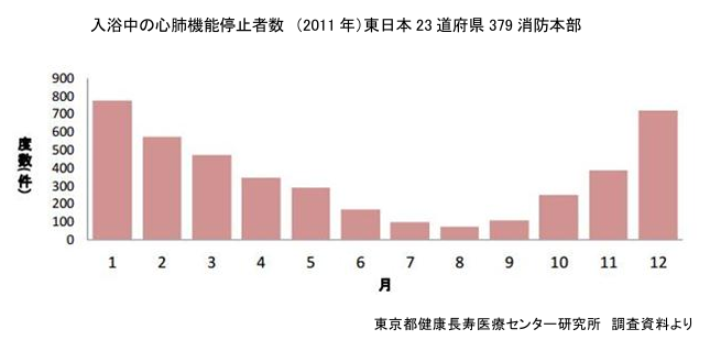 外気温が低くなる1月は、入浴中に心肺機能停止となる人が、最も少ない8月のおよそ11倍であり、このように増加する原因は、ヒートショックによるものといえます。
